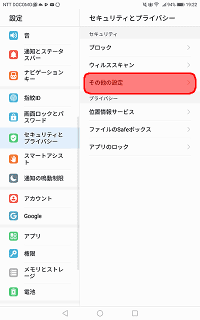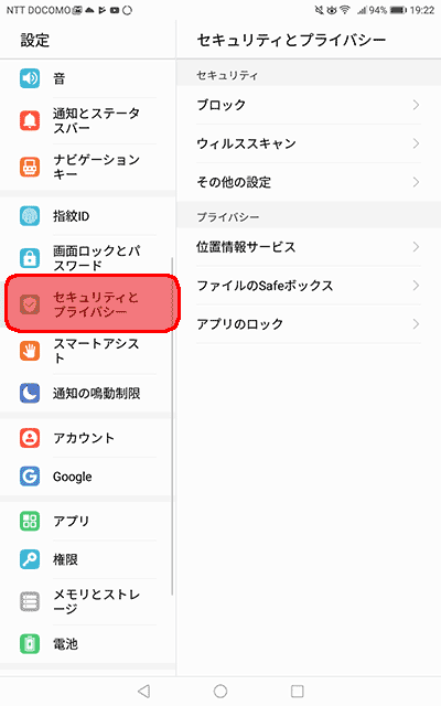1.ご購入前に「Android端末」の「設定」を立ち上げ、「セキュリティとプライバシー」をタップ。