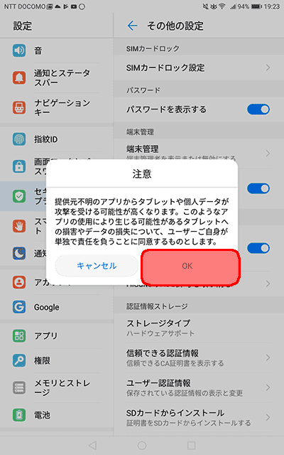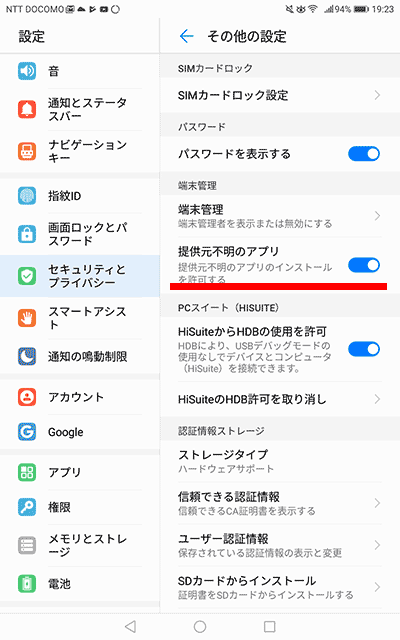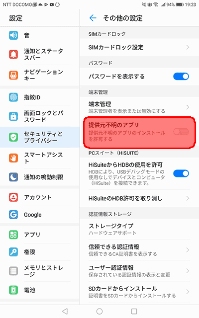 5.「提供元不明のアプリ」が有効になっていることを確認ください。