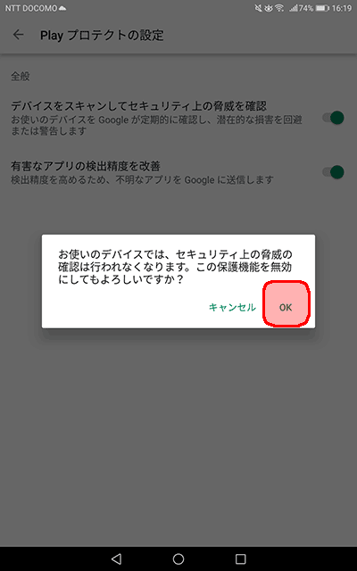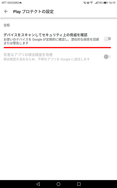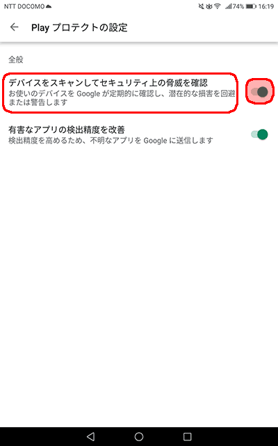 15.「デバイスをスキャンしてセキュリティ上の脅威を確認」がオンになっている場合は「オフ」にする。