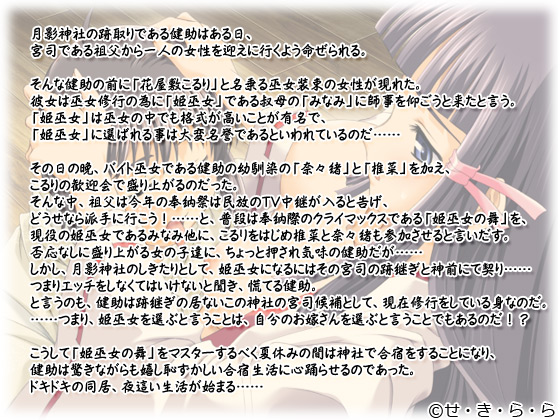 こうして「姫巫女の舞」をマスターするべく夏休みの間は神社で合宿をすることになり、健助は驚きながらも嬉し恥ずかしい合宿生活に心踊らせるのであった。