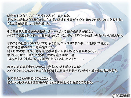 彼女の名前は「蜜柑(みかん)」と言い、話を聞いてみるとメイドをクビになった彼女は「猫神さま」のお告げを受けて、伊吹へ奉仕しに来たと言う。