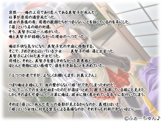 それは「篠」に、死んだ恋人の面影が見えるからなのか、義理とはいえ、「娘」という女性に対する禁忌による高揚なのか、それすらも判断できないほどに……