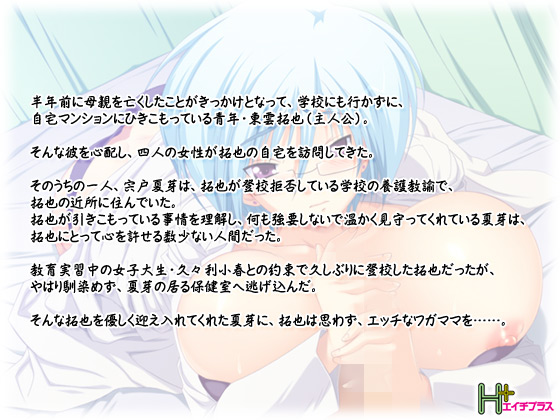 教育実習中の女子大生・久々利小春との約束で久しぶりに登校した拓也だったが、やはり馴染めず、夏芽の居る保健室へ逃げ込んだ。そんな拓也を優しく迎え入れてくれた夏芽に、拓也は思わず、エッチなワガママを……。
