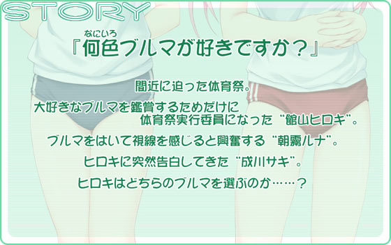 主人公・ヒロキは大のブルマ好きで、ブルマのために体育祭の実行委員会になった猛者。そんな主人公がタイプの異なる二人のブルマ美少女と、くんずほぐれつのブルマエッチに没頭しちゃう、ってお話だ。