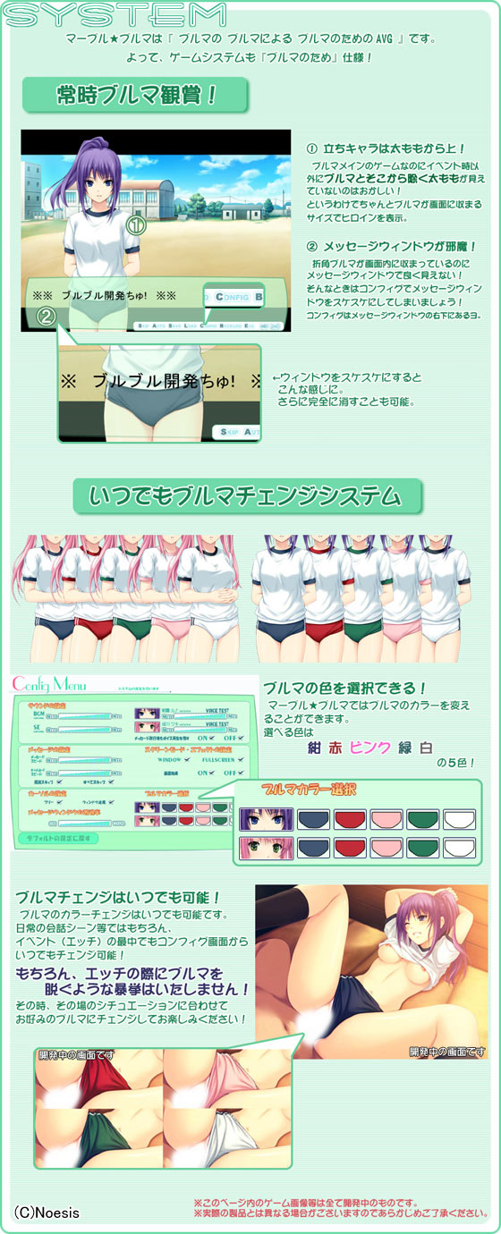 本作では、二人のヒロインはぞれぞれ紺、赤、緑、ピンク、白の五色から好きな色のブルマを履かせることが可能。ブルマの色はゲーム中のコンフィグからいつでもどこでも、それがエッチの最中であってもカラーチェンジできちゃうぞ。