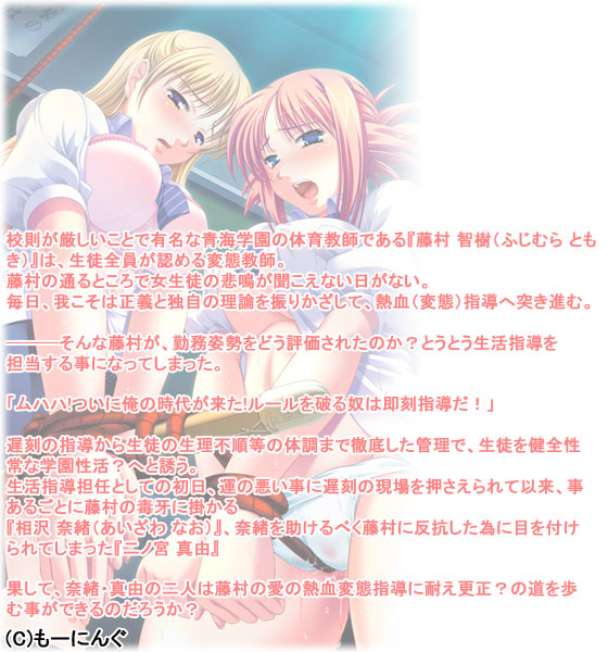 生活指導担任としての初日、運の悪い事に遅刻の現場を押さえられて以来、事あるごとに藤村の毒牙に掛かる『相沢 奈緒(あいざわ なお)』、奈緒を助けるべく藤村に反抗した為に目を付けられてしまった『二ノ宮 真由』。
