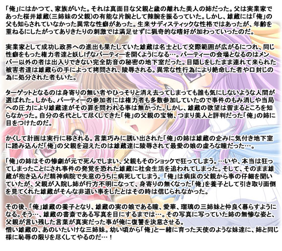 その後、「俺」は雄蔵の養子となり、雄蔵の実の娘である瞳、愛華、瑠璃の三姉妹と仲良く暮らすようになる。そう…、雄蔵の書斎である写真を目にするまでは…。その写真に写っていた姉の無惨な姿と、父親が言い残した言葉が真実だった事が俺に復讐を決意させる。