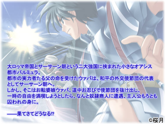 しかし、そこはお転婆娘ウァバ。道中お忍びで使節団を抜け出し、一時の自由を満喫しようとしたら、なんと○○商人に遭遇、主人公もろとも囚われの身に。