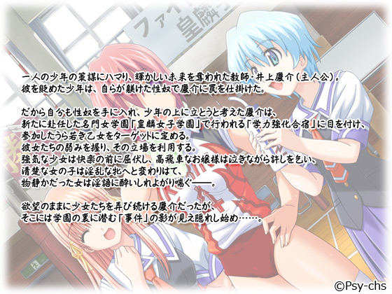 だから自分も性奴を手に入れ、少年の上に立とうと考えた慶介は、新たに赴任した名門女学園「皇麟女子学園」で行われる「学力強化合宿」に目を付け、参加したうら若き乙女をターゲットに定める。