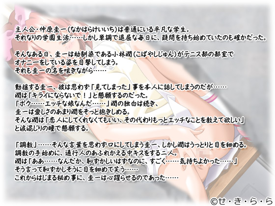 そんなある日、圭一は幼馴染である小林潤(こばやしじゅん)がテニス部の部室でオナニーをしている姿を目撃してしまう。