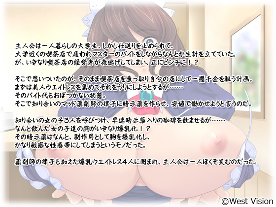 薬剤師の律子も加えた爆乳ウエイトレス4人に囲まれ、主人公は一人ほくそ笑むのだった。