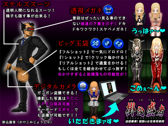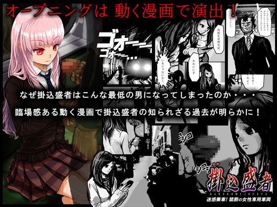 車内で可愛い娘を見つけては下着をのぞいたり、盗撮したり、ぶっかけを繰り返す主人公『掛込盛者』。