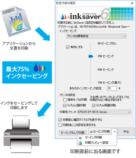 InkSaver 6は、プリンタのインクやトナーの使用量を最大75%カットできる節約ソフトです。