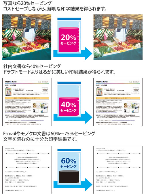 写真印刷は20%、年賀状の宛名印刷は40%、モノクロ印刷は60〜75%など、お好みの設定でインク節約できます。