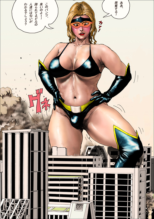 フタナリの巨大ヒロインによる都市破壊、殺戮、自慰作品です。巨大化した女教師がエロチックに暴走し、破廉恥な授業をする。激しい破壊シーンの連続。露出狂で臭気フェチ、臭うマイクロビキニに蒸れたニーハイブーツを身に着け、町に襲いかかる。破壊シーンは数枚のアニメ風連続画で臨場感を表現しています。
