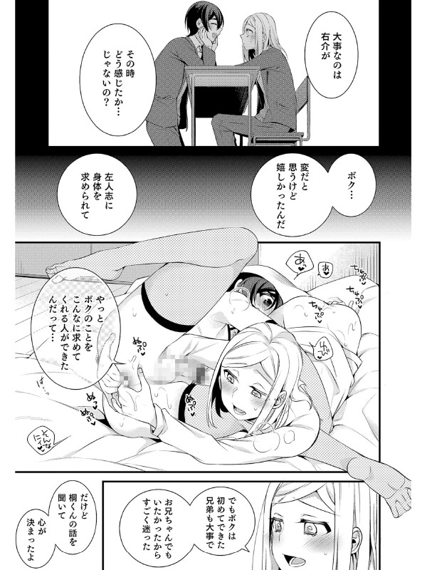 クラスメイトの桐くんは左人志とのことで悩んでいた僕にアドバイスをくれた恩人。彼のおかげで左人志と仲直りできた右介は、今日も桐くんと秘密のお兄ちゃん会議を行いますv「お兄ちゃん会議」とはお互いの身体を開発しあい、お互いの弟たちを喜ばせるためのHの特訓なのですv※ オトコのコHEAVEN Vol.45 痴○○○×男の娘 収録作品