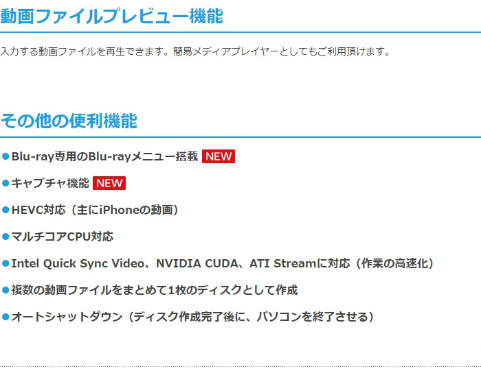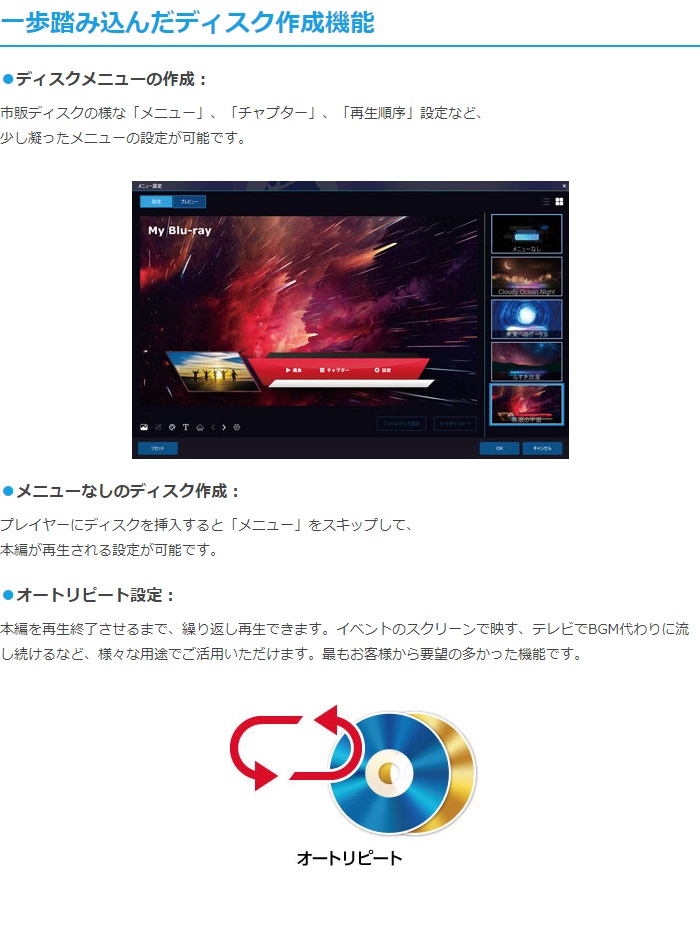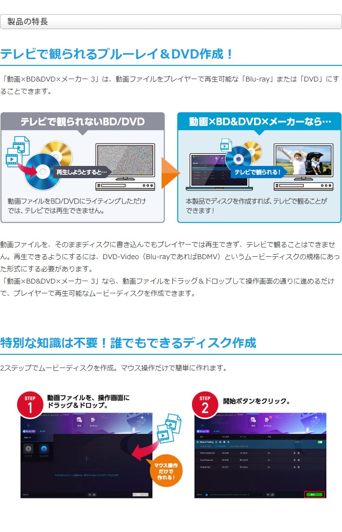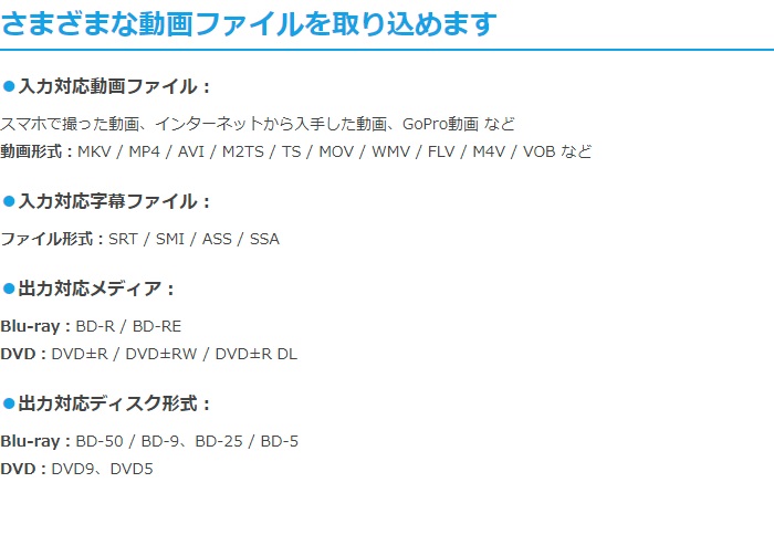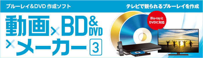 「動画×BD&DVD×メーカー 3」は、動画ファイルをプレイヤーで再生可能な「Blu-ray」または「DVD」にすることできます。