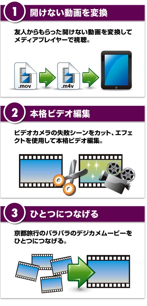 動画:mp4, m4v, mov, iPod用, iPhone用, iPad用, Apple TV用