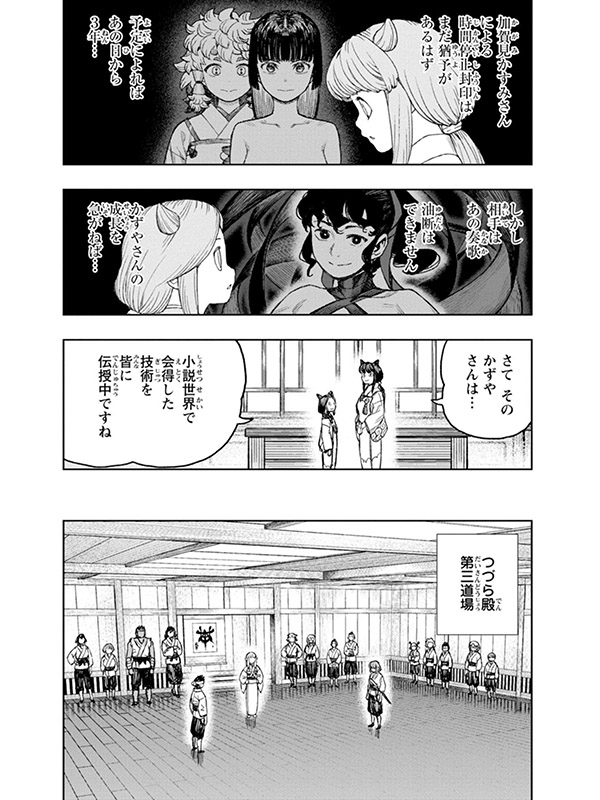 母・奏歌が封印されている3年の間に、彼女に対抗する力を付けるべく、つづら殿での修行に励むかずや。