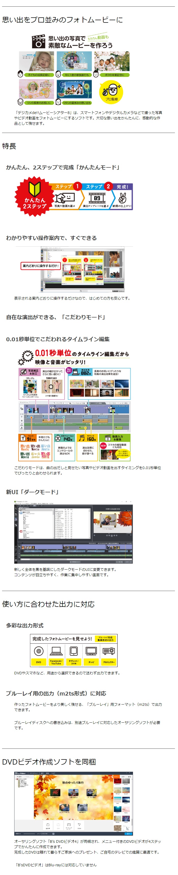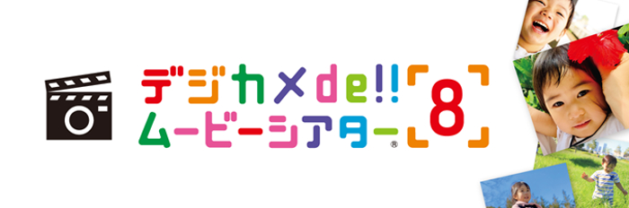 「デジカメde!!ムービーシアター8」は、スマートフォンやデジタルカメラなどで撮った写真やビデオ動画をフォトムービーにするソフトです。大切な思い出をかんたんに、感動的な作品として残せます。