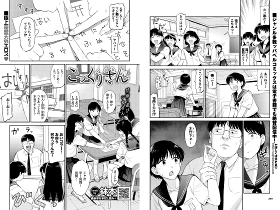 放課後の教室で友達と降霊術をしていた木野下は、逃げ遅れ教師の壺井に捕まってしまう。 しかし面倒な説教をくらっていたはずが、徐々に壺井の様子がおかしくなりズボンを下ろしながら「儀式の続きをしなければ推薦入試を取り消す」と言って来て…? ※ COMIC BAVEL 2021年10月号 収録作品