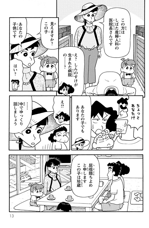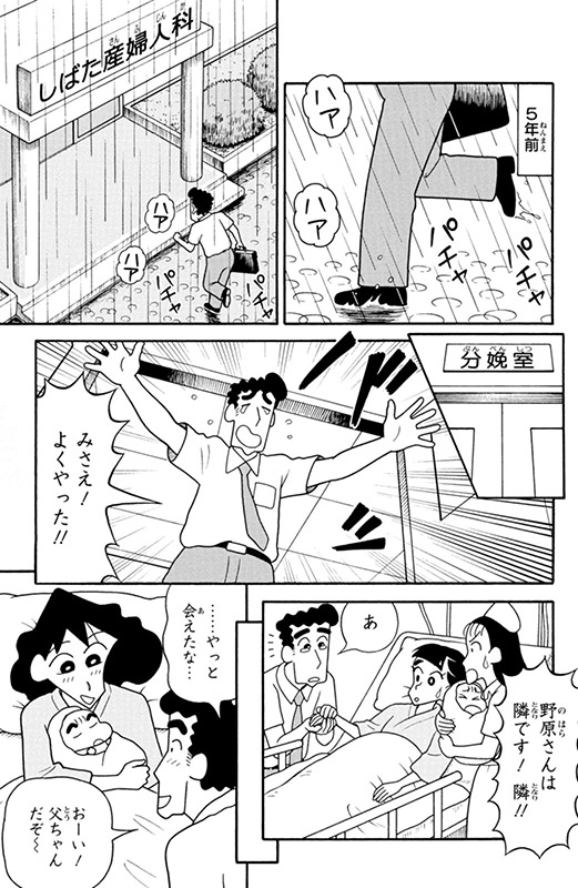 雨の日にひろしとみさえのもとに可愛らしい赤ちゃんが誕生した。ひろしが考えた名前のメモは濡れてほとんど読めなくなっていたが、読める文字を繋げてみると「しん...の...すけ」。