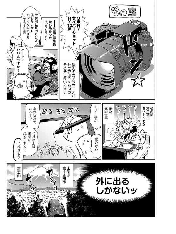 その3.カメラマニアがサブで使用するくらいのお高いカメラを編集長からもらったあべ先生。そのカメラを持って気分転換に富士山へキャンプに行くが…!?その4.単行本などの印税でヒット出版社からの借金をいくら減らせたのか!?な