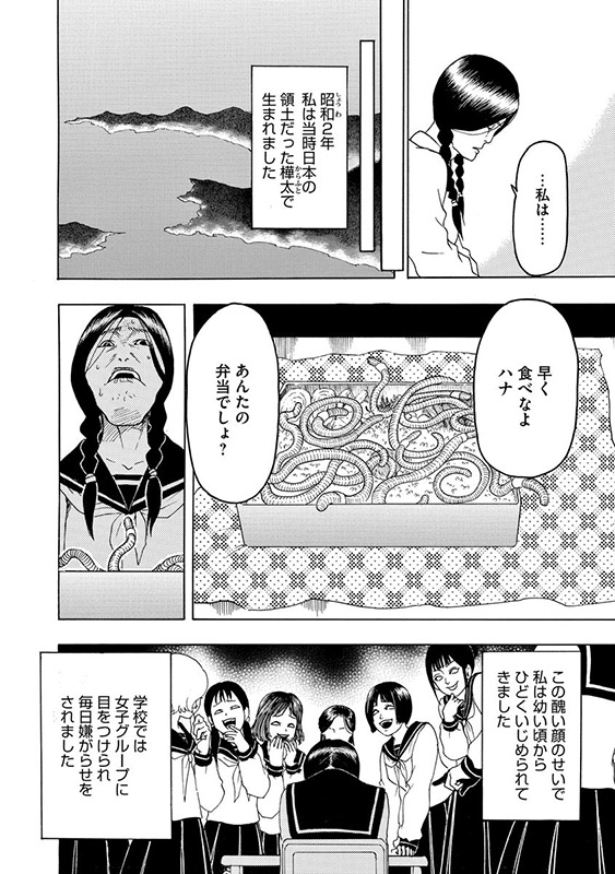 昭和20年、太平洋戦争が終わりかけていた時代、樺太(からふと)で生まれ育った少女・市村ハナは、醜い容姿のため女学校で凄惨ないじめを受けていた。いじめのリーダー格は大会社の令嬢・高島津絢子。彼女によって泥棒の濡れ衣を着せられたハナは、退学に追い込まれてしまう。