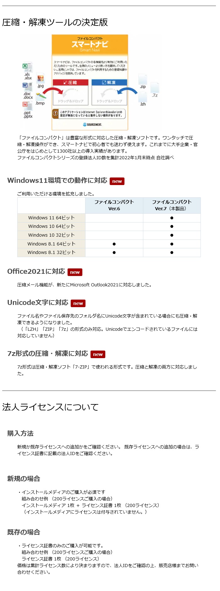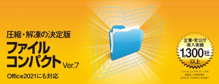 「ファイルコンパクト」は豊富な形式に対応した圧縮・解凍ソフトです。ワンタッチで圧縮・解凍操作ができ、スマートナビで初心者でも迷わず使えます。これまでに大手企業・官公庁をはじめとして1300社以上の導入実績があります。