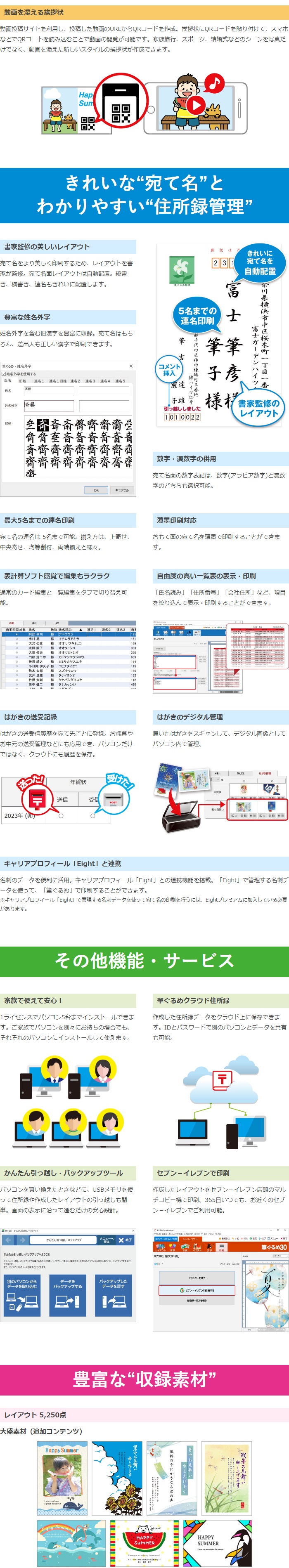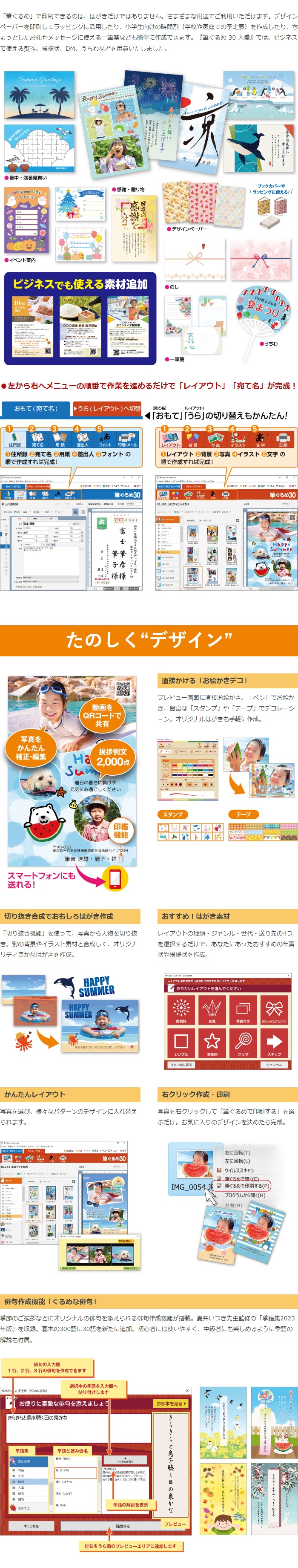 筆ぐるめ」で印刷できるのは、はがきだけではありません。さまざまな用途でご利用いただけます。デザインペーパーを印刷してラッピングに活用したり、小学生向けの時間割(学校や家庭での予定表)を作成したり、ちょっとしたお礼やメッセージに使える一筆箋なども簡単に作成できます。『筆ぐるめ 30 大盛』では、ビジネスで使える熨斗、挨拶状、DM、うちわなどを用意いたしました。