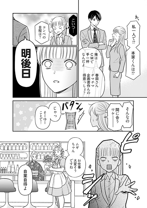 営業成績ビリのつむぎは、イケメンで営業成績トップの同期・本家篤にその仕事のできなさを煽られ、日々ストレスを感じていた。なんでマジメな私はビリでソシャゲ三昧のあいつが……!しかしある日、つむぎが実家の女装スナックで接客用の変装をしながら手伝っていると、偶然本家が飲みに来て!?嘘と復讐から生まれる勘違いラブロマンス!【恋するソワレ】