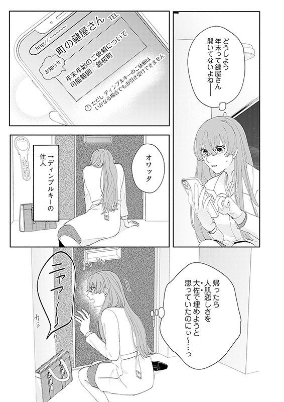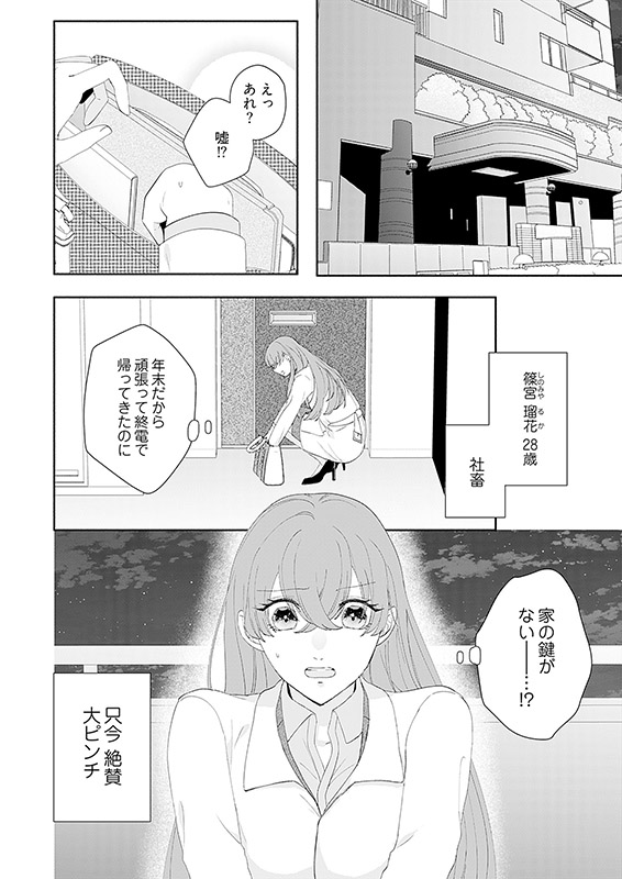 社畜の篠宮瑠花(しのみやるか)は年末に鍵を無くしてしまい絶賛ピンチ中。今日は愛猫に人肌の恋しさを慰めてもらおうと思ったのに!