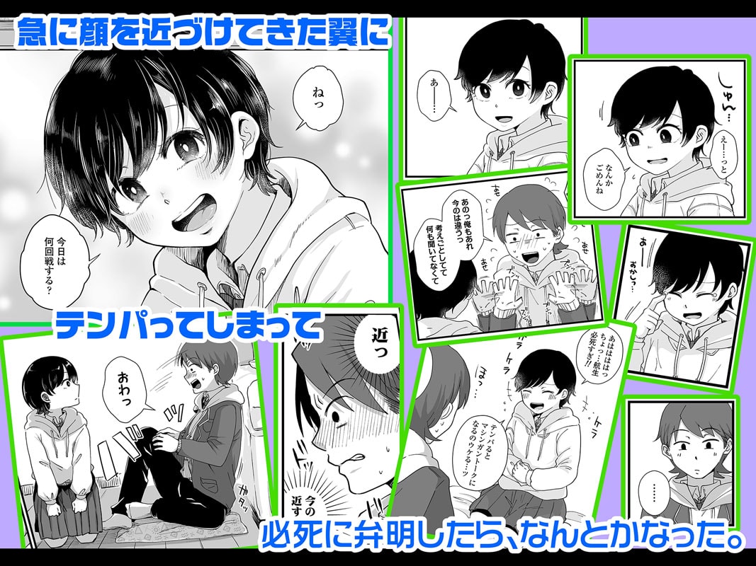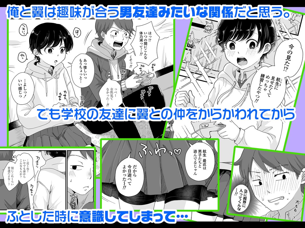 航生(こうき)にとって翼(つばさ)は同中からの付き合い。男友達よりもゲームの腕前が近くて、いつも一緒に遊んでいた。ある日男友達から言われた。「…前から思ってたけどさ、告んねーの?」翼を’そういう目’で見たことはなかった航生だったが、ゲームに負けた罰ゲームで、翼にマッサージすることに。ふにっ。初めて触れる翼の背中の柔らかさ。すー。すー。「お おーい、翼…?」「マッサージ、続けるからな〜…」スカートをめくる航生の目の前に、翼を【そういう目】で見せるには十分すぎる光景が広がっていた…。