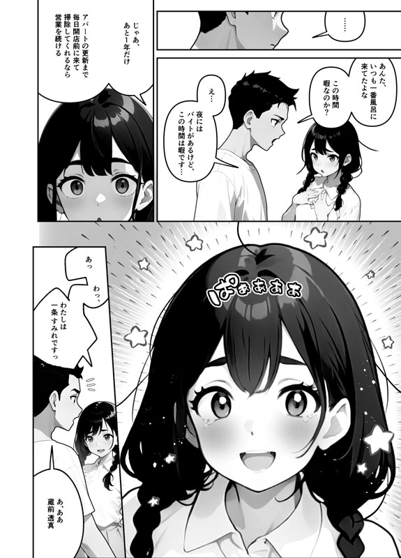 両親から銭湯を継いだがやる気ゼロの透真。すぐ閉店するつもりだったのに、現れたのは風呂なし物件に住む世間知らずな女子大生すみれ。バイト代はゼロ、一番風呂が報酬。 どうせすぐ逃げると思ってたのに――毎日ちゃんと来て真面目に掃除する、明るい彼女に惹かれていく。