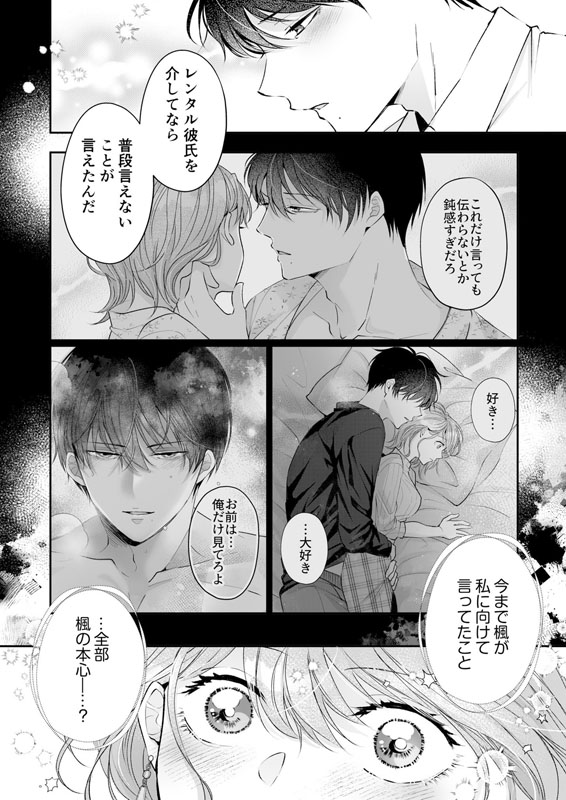 OL・鏡花は、恋愛漫画が大好きな、こじらせ処女。男性慣れのためにレンタル彼氏を利用するも、やってきたのは幼馴染で同僚の楓で!?楓は地味で無愛想なはずなのに、理想の彼氏になりきってくれた。「本当の彼氏とだったらお泊まりルート確定なのにな〜」冗談で呟くと──「俺じゃ嫌?」初めて見る楓のオトコの表情。唇に、胸に、首筋に触れられて、舐められて…初めての快感は苦しくなるほど気持ちいい…とろとろに溶けたカラダもイキ顔も見られちゃって…ただの”幼馴染”には戻れない。