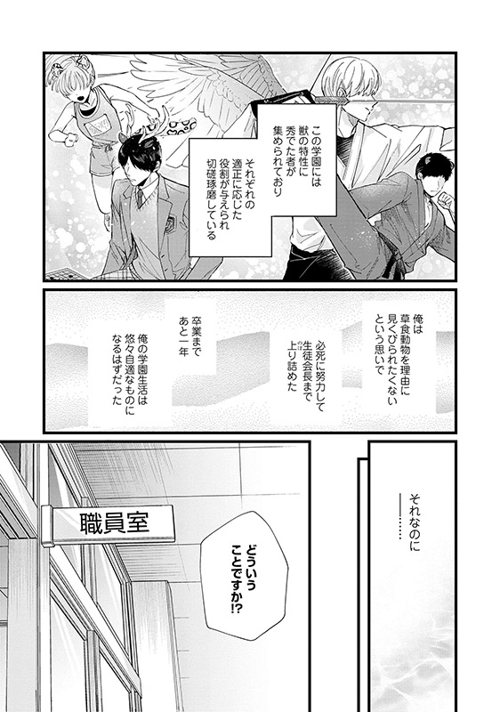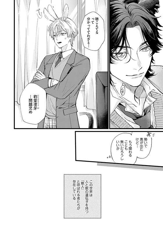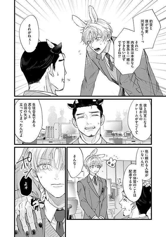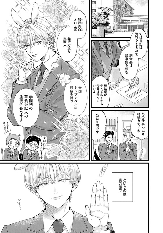 品行方正・成績優秀で、草食系の種族として学園初の生徒会長となった兎の真白は、黒豹の凌牙と寮の同室になる。